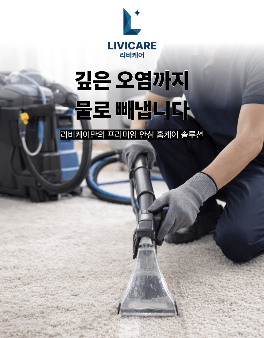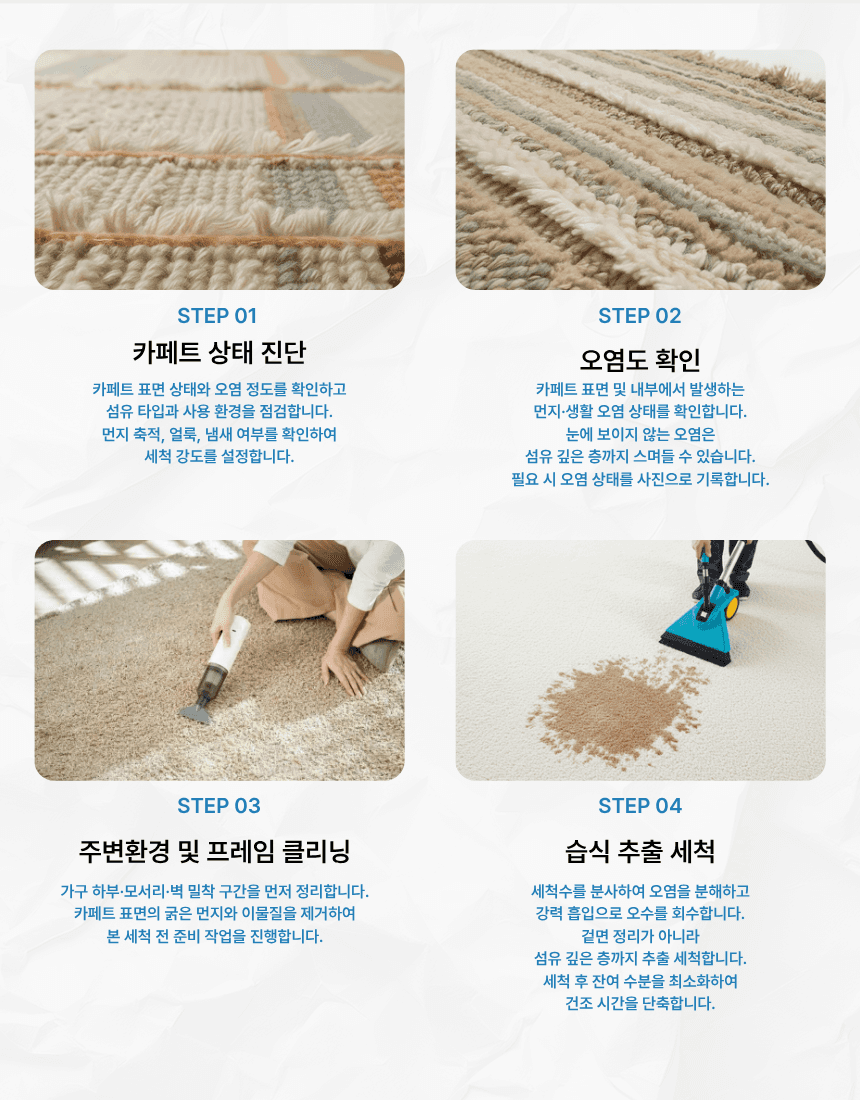 카페트 섬유 깊숙이 쌓인 먼지·진드기·오염물을 제거해 생활 공간을 위생적으로 관리하는 전문 카페트 케어 서비스