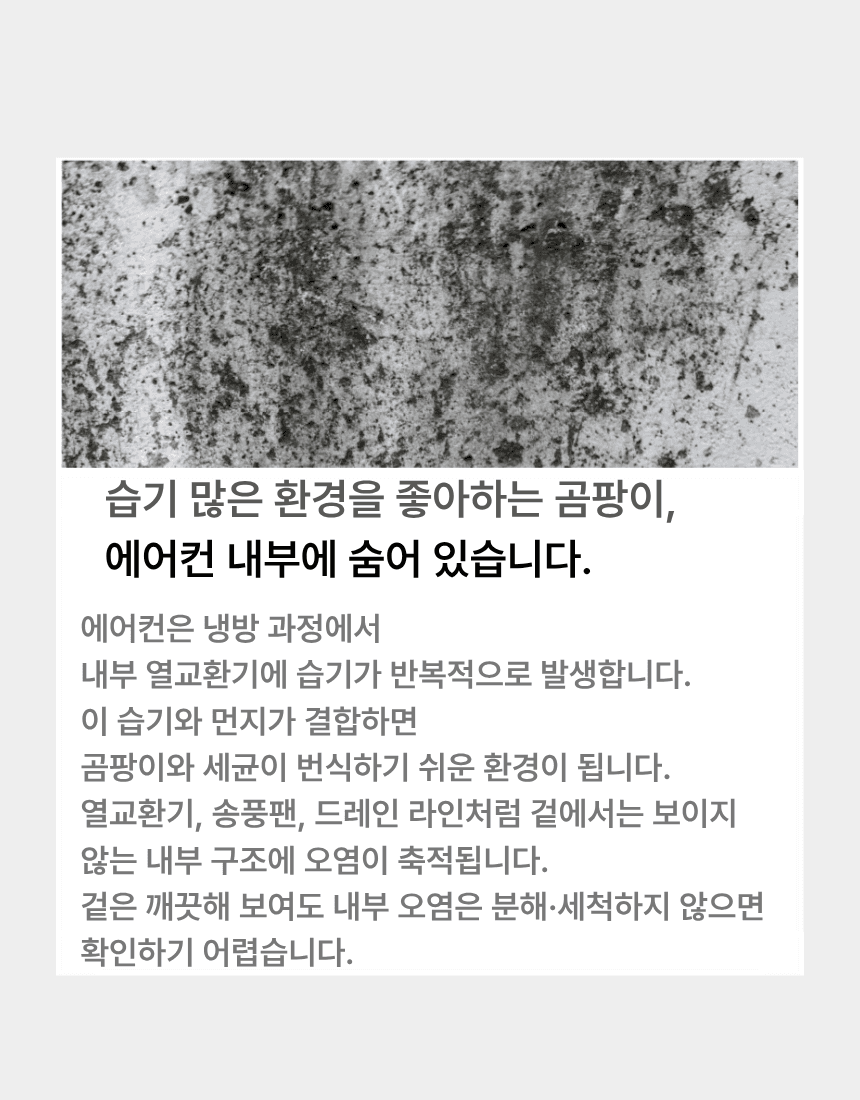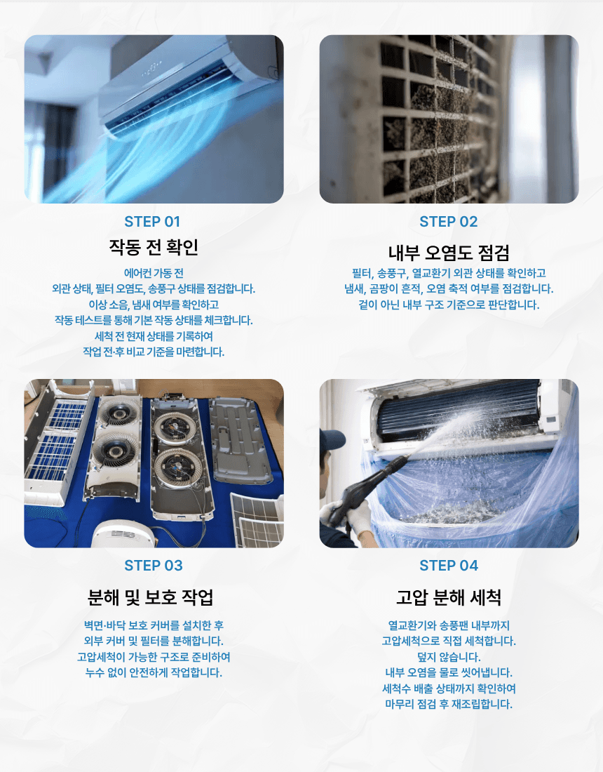 에어컨을 완전 분해해 고압세척과 인증된 약품으로 곰팡이와 오염을 제거한 뒤 건조 후 재조립까지 진행하는 전문 에어컨 분해 세척 서비스